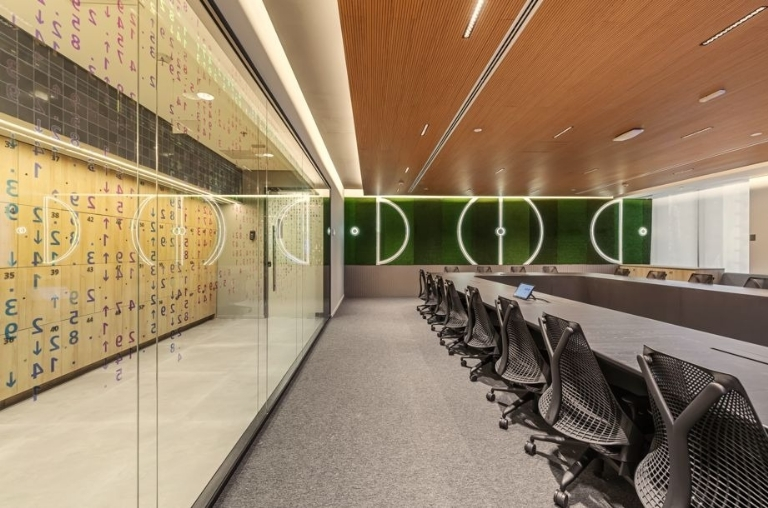 Logo na recepção, uma Arena com bar integrado convida visitantes e colaboradores a acompanharem campeonatos em tempo real, transformando reuniões em experiências coletivas. Três salas temáticas, incluindo uma inspirada no futebol, dão o tom esportivo e digital que permeia toda a operação.